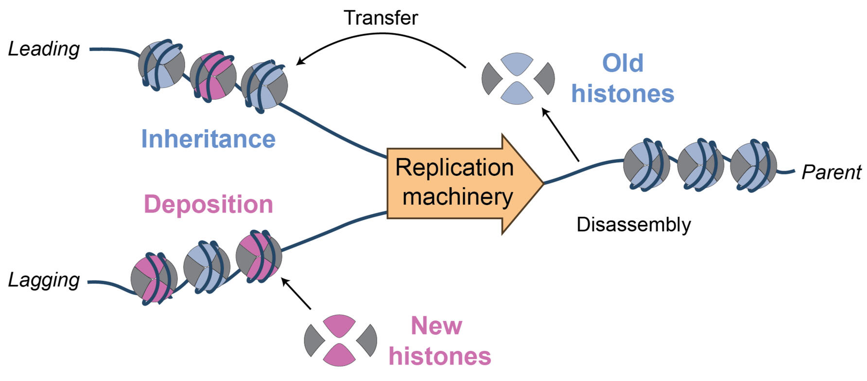 The storage and transmission of genetic information is a fundamental challenge faced by all cellular organisms. Chromosomes must be folded and compacted in an orderly fashion to fit inside cells but retain dynamic flexibility to allow for rapid information access. These intricate structures must likewise allow for efficient disassembly and reassembly during replication.In eukaryotic organisms, nucleosomes function as the most basic unit of chromosome organization directly binding and assembling on DNA to modulate DNA topology, drive compaction, and regulate transcription. They consist of a dimer of dimers with two copies each of the histones H3, H4, H2A and H2B, that tightly bind and wrap DNA, while leaving long exposed tails available for post-translational modification that can carry epigenetic information. This basic unit is modulated by a myriad of chaperones and remodellers that modify, reposition, and restructure nucleosomes to accomplish various essential chromosomal functions.The dynamic events that underlie the disassembly and reassembly of nucleosomes during replication remains a long-standing puzzle in chromosome biology. Nucleosomes pose a two-fold problem for the replication machinery. They must be removed to allow access to the genetic information. However, parental histones must also be transferred to the daughter-strands to ensure epigentic information is faithfully replicated. Moreover, this inheritance pathway must be coordinated with the deposition of newly synthesised histones to ensure chromosome duplication.