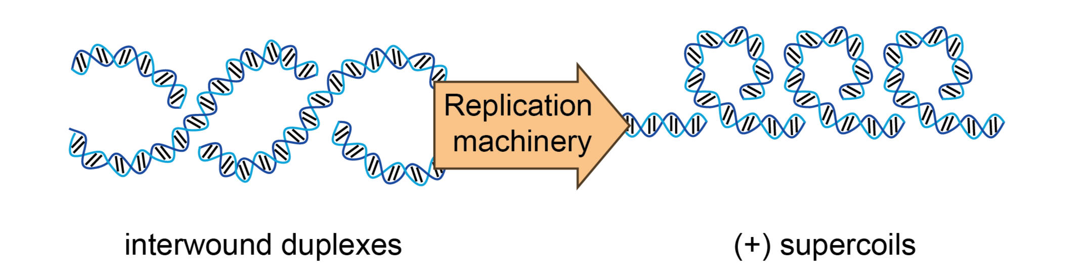 While the double-helical structure of duplex DNA is advantageous for the storage and maintenance of genetic information, it poses major challenges during essential cellular processes, such as transcription and replication, when the information-rich DNA bases must be accessed. Separation of the two single strands leads to the build-up of superhelical tension, which, if left unresolved, exerts extreme forces in the form of torque that disrupts critical enzymatic events on chromosomes.During replication, separation of the two daughter-strand templates by the helicase leads to overwinding and the formation of positive supercoils ahead of the replication fork. Likewise, superhelical tension forms on the daughter strands as a consequence of polymerase synthesis. Polymerases must travel on a helical path during successive rounds of nucleotide incorporation to generate a helical, double-stranded DNA product. Since the physical tethering of the polymerases within the replisome holds them in fixed orientations, the daughter strands must rotate to accommodate the path of synthesis.Resolution of superhelical tension is critical to ensure replication fork progression and avoid chromosome damage. To date, studies of this important problem have been focused on topoisomerases, which are a specialized class of enzymes that can resolve superhelical tension. Studies of these factors have proven tremendously fruitful yielding several classes of potent antibiotics and anticancer drugs (e.g. ciprofloxacin and camptothecin). However, the other side of the problem – namely, how replisomes operate when faced with topological stress – has remained largely unexplored. Replisomes must possess some resistance to topological stress given the dynamics at rapidly moving replication forks, near chromosome ends, and under moderate conditions of inhibition, where topoisomerases struggle to keep pace with fork progression.