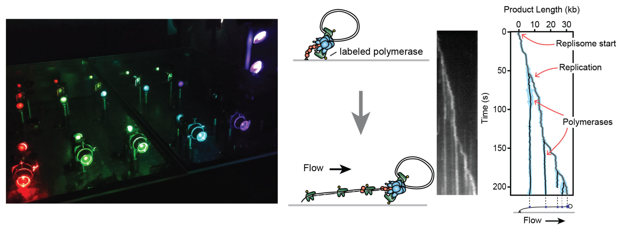 Classical biochemical methods have provided tremendous insight into the basic factors and mechanisms of DNA replication. However, these methods are fundamentally limited by ensemble averaging, which obscures differences within a population. Gaining access to a more detailed molecular understanding of replisome dynamics depends on the development and implementation of novel imaging approaches.We employ cutting-edge single-molecule imaging approaches that provide high spatial and temporal resolution to study the dynamics of single replisomes in real-time. To study the coordination of daughter-strand synthesis, we use a multidimensional DNA flow-stretching assay in which a flow through a flowcell applies a force on individual surface immobilized DNA substrates. We then directly track replication fork progression either using micron-sized beads attached at the DNA ends or by fluorescence staining. Using co-localization single-molecule spectroscopy with fluorescently labeled replisome components reveals the distribution of individual factors in and around the replication fork as well as their exchange dynamics.To learn more about our active projects, please click on our researchers in the Team tab.